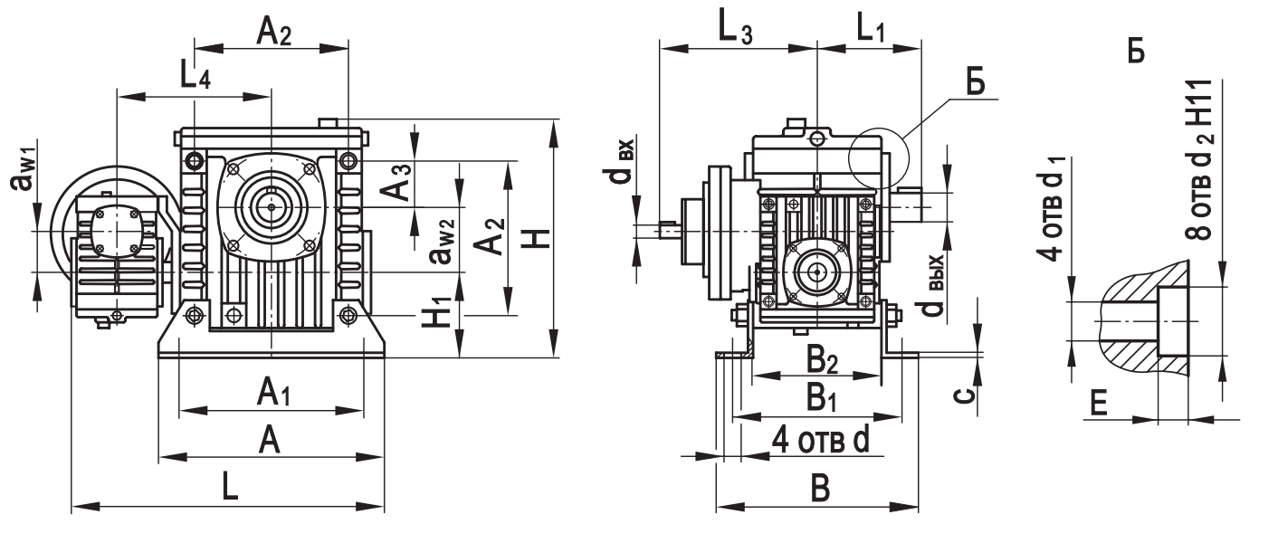 Типоразмер аW1 аW2 А А1 А2 А3 В В1 В2 L* L1* L2max L3* L4 Н Н1 с  d d 1 d2 Е dвх dвых